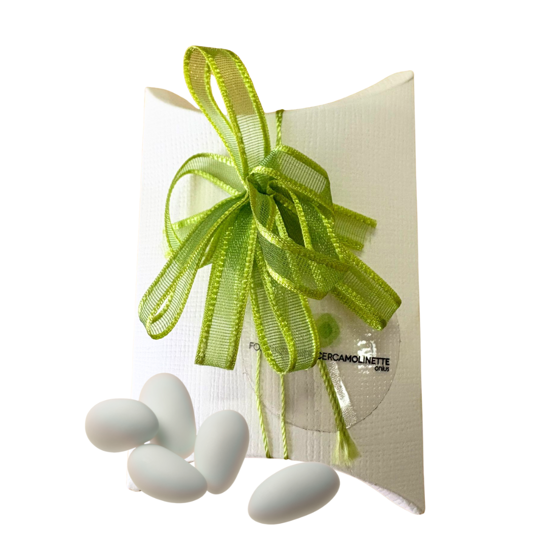 In cartoncino avorio, con fiocco verde e adesivo FRM, contengono una bustina con cinque confetti bianchi mandorlati e biglietto personalizzabile.