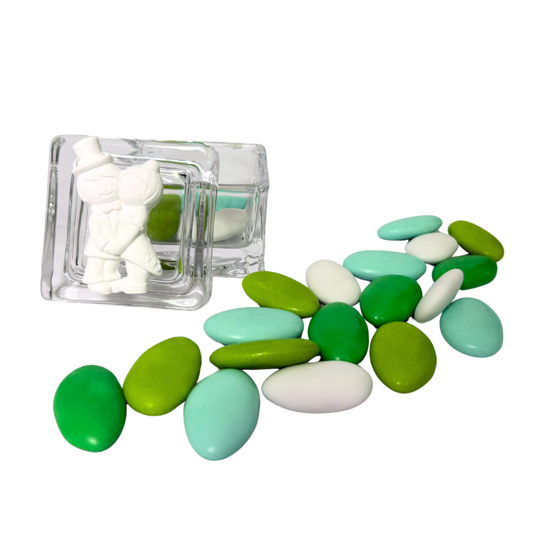 Un cubotto in vetro elegante arricchito da un’applicazione decorativa a tema (matrimonio, nascita o generica), pensato per rendere ancora più speciale il ricordo del tuo evento.