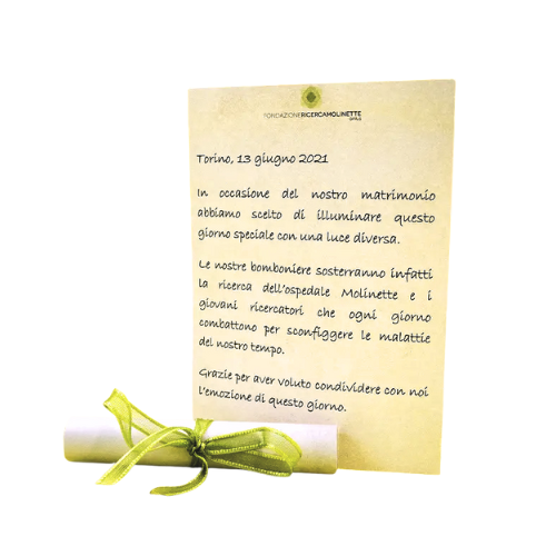 Carta pergamena personalizzabile con un messaggio, per comunicare il vostro impegno a fianco della Ricerca dell’Ospedale Molinette.